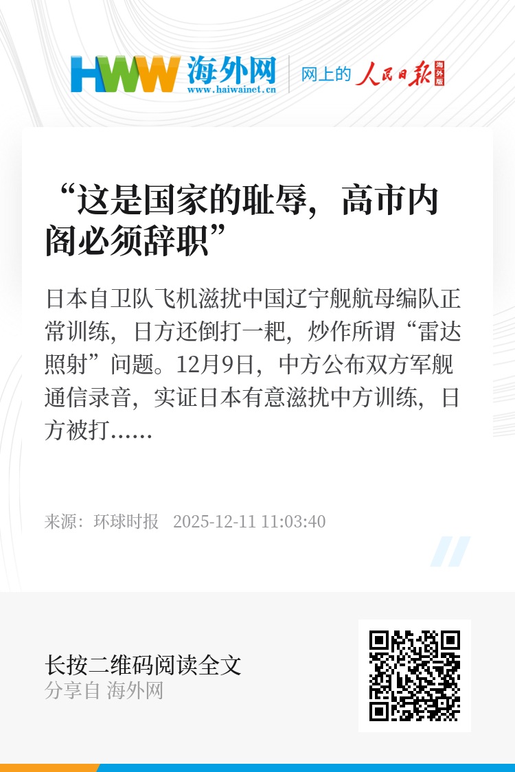 日本自卫队飞机滋扰中国辽宁舰航母编队正常训练,日方还倒打一耙,炒作所谓“雷达照射”问题。12月9日,中方公布双方军舰通信录音,实证日本有意滋扰中方训练,日方被打脸。随后,有日本评论员公开呼吁:“这是国家的耻辱,高市内阁必须辞职。”