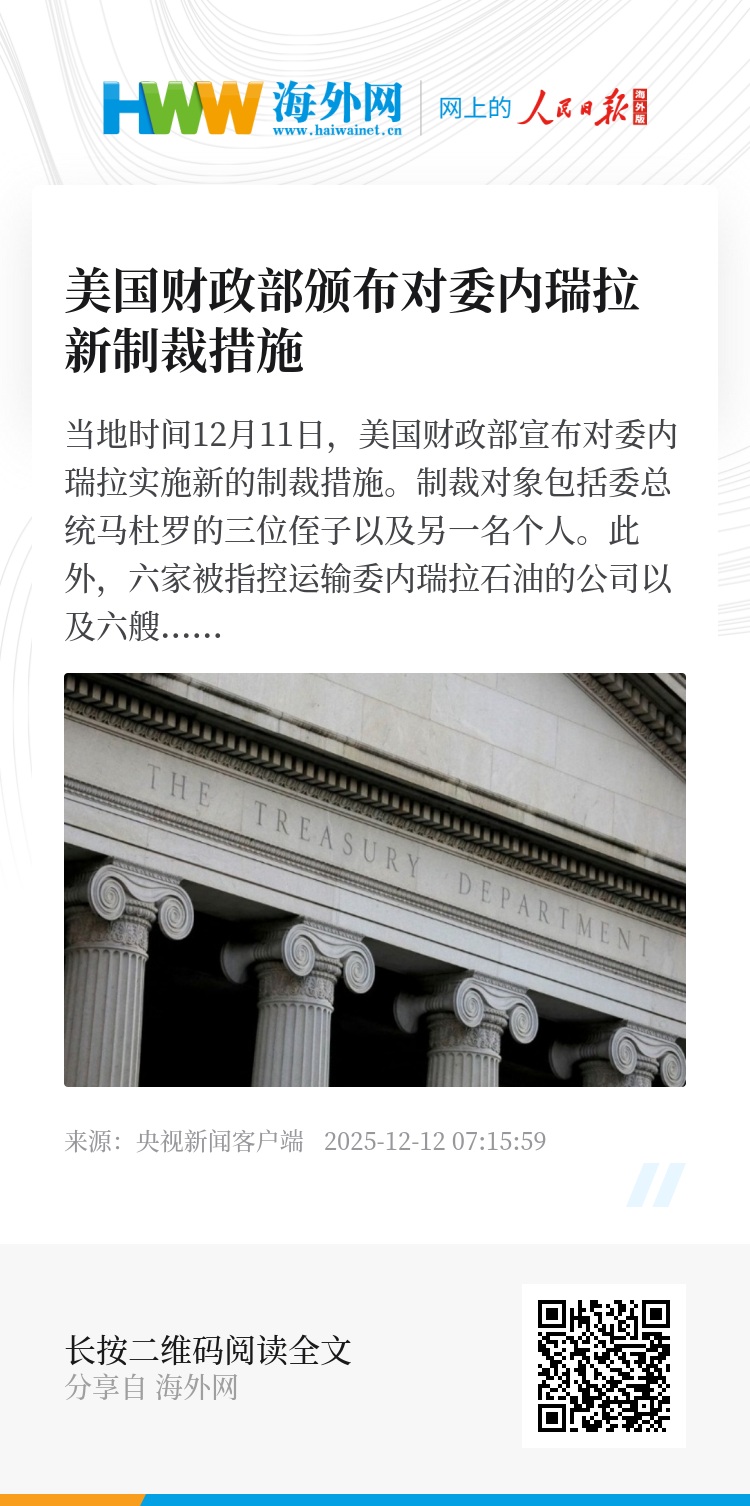 当地时间12月11日,美国财政部宣布对委内瑞拉实施新的制裁措施。制裁对象包括委总统马杜罗的三位侄子以及另一名个人。此外,六家被指控运输委内瑞拉石油的公司以及六艘运输该国石油的船只也受到了制裁。