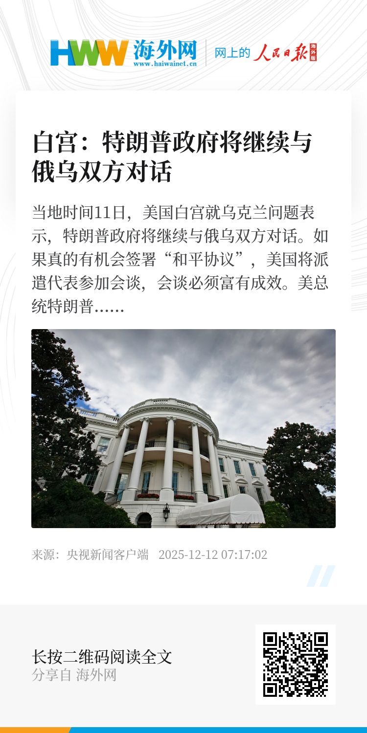 当地时间11日,美国白宫就乌克兰问题表示,特朗普政府将继续与俄乌双方对话。如果真的有机会签署“和平协议”,美国将派遣代表参加会谈,会谈必须富有成效。美总统特朗普已了解乌克兰的最新提议。