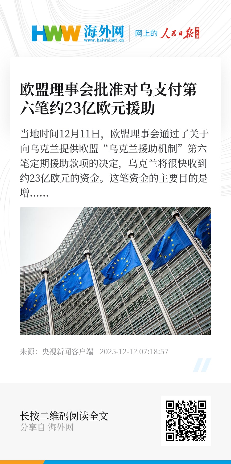 当地时间12月11日,欧盟理事会通过了关于向乌克兰提供欧盟“乌克兰援助机制”第六笔定期援助款项的决定,乌克兰将很快收到约23亿欧元的资金。这笔资金的主要目的是增强乌克兰的宏观金融稳定性,并支持其公共行政部门的正常运作。