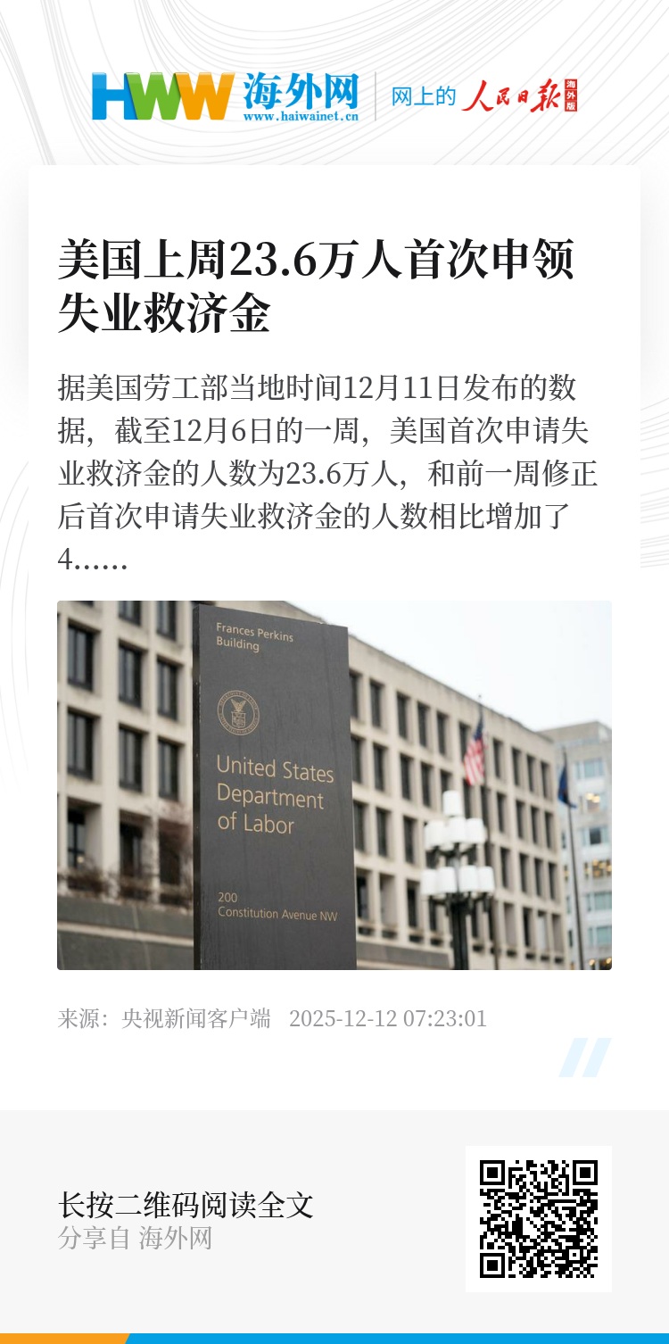 据美国劳工部当地时间12月11日发布的数据,截至12月6日的一周,美国首次申请失业救济金的人数为23.6万人,和前一周修正后首次申请失业救济金的人数相比增加了44000人。(央视记者 曹健)