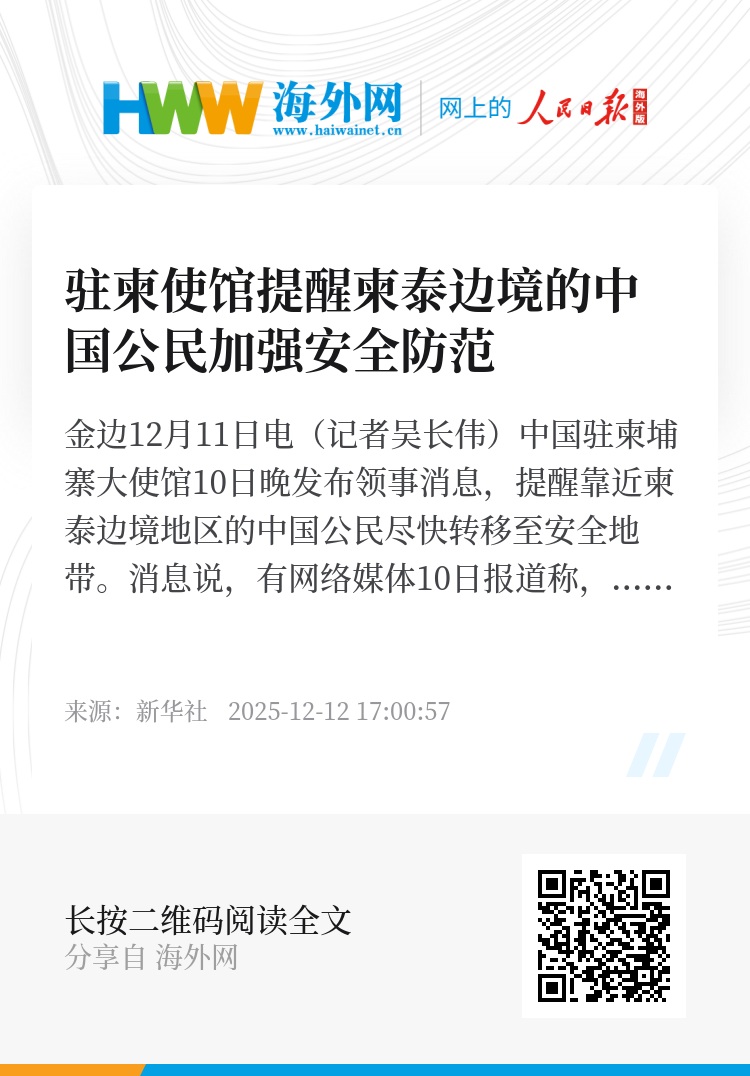 新华社金边12月11日电(记者吴长伟)中国驻柬埔寨大使馆10日晚发布领事消息,提醒靠近柬泰边境地区的中国公民尽快转移至安全地带。