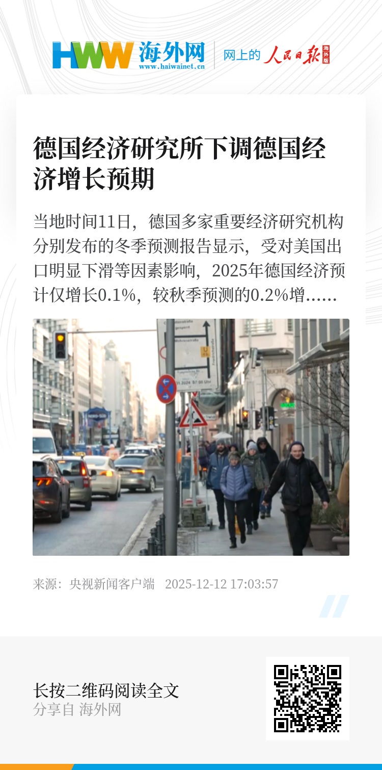 当地时间11日,德国多家重要经济研究机构分别发布的冬季预测报告显示,受对美国出口明显下滑等因素影响,2025年德国经济预计仅增长0.1%,较秋季预测的0.2%增幅再度下调。