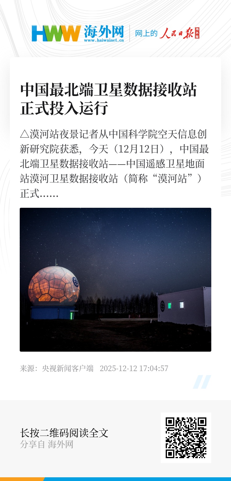 漠河站位于黑龙江省大兴安岭地区漠河市以西约2公里,冬季最低温度可达到零下53度,是我国纬度最高的卫星数据接收站。该站于2022年7月启动建设,2023年10月投入试运行。截至2025年11月底,漠河站已成功接收卫星数据33411轨,获取数据量超过1658TB,数据接收成功率达到99.79%以上。