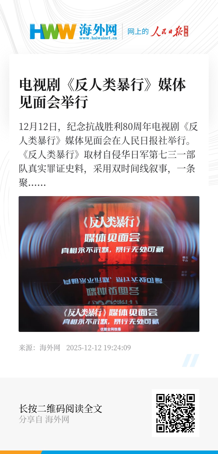 12月12日,纪念抗战胜利80周年电视剧《反人类暴行》媒体见面会在人民日报社举行。