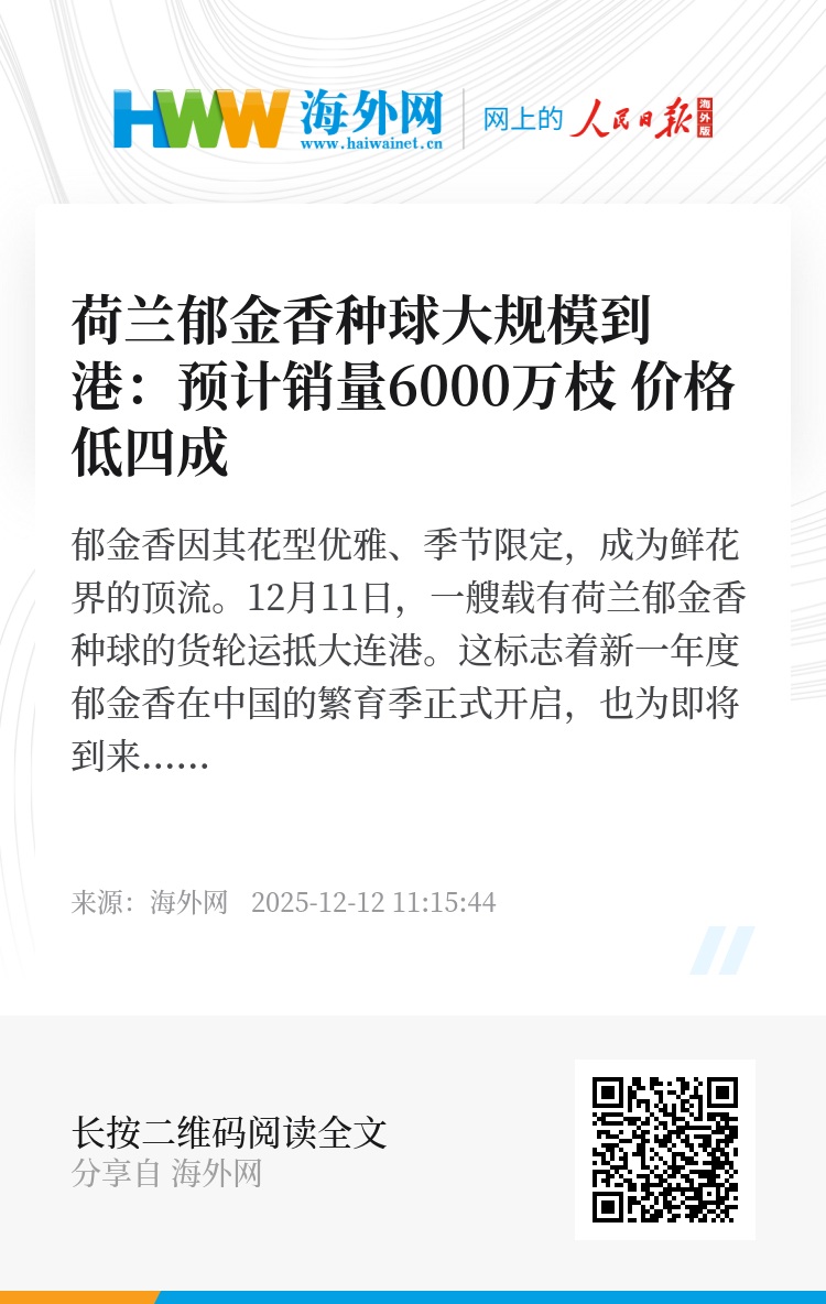 郁金香因其花型优雅、季节限定,成为鲜花界的顶流。12月11日,一艘载有荷兰郁金香种球的货轮运抵大连港。这标志着新一年度郁金香在中国的繁育季正式开启,也为即将到来的年末节日鲜花消费市场拉开序幕。