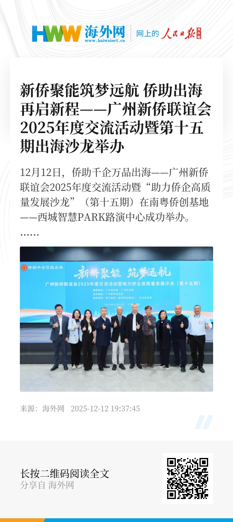 本次活动的成功举办,进一步凝聚了侨界发展合力,拓展了“侨助出海”合作空间。未来,广州新侨联谊会将持续发挥侨界资源优势,架好跨境合作桥梁,当好侨企服务“娘家人”,为广州在推进中国式现代化建设中走在前列贡献源源不断的新侨力量。