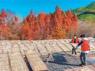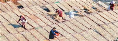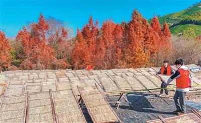 图为村民和志愿者正在晾晒粉皮。