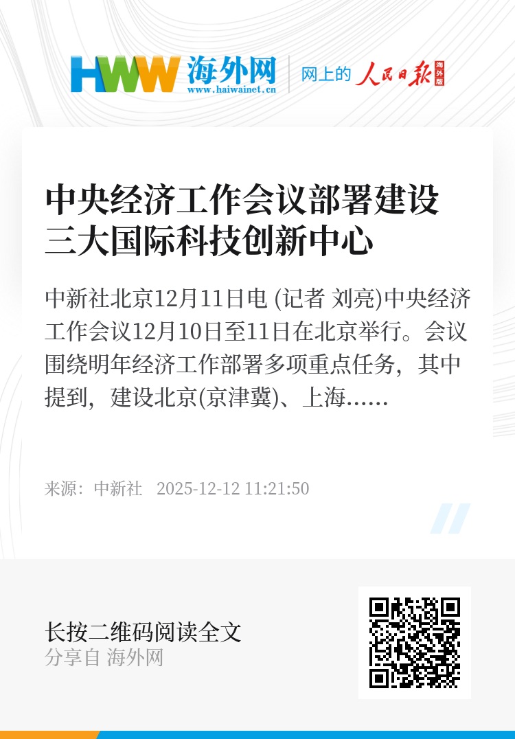 中新社北京12月11日电 (记者 刘亮)中央经济工作会议12月10日至11日在北京举行。会议围绕明年经济工作部署多项重点任务,其中提到,建设北京(京津冀)、上海(长三角)、粤港澳大湾区国际科技创新中心。