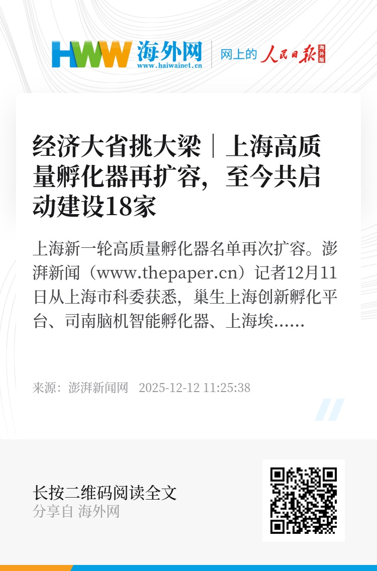 2023年6月,上海发布《上海市高质量孵化器培育实施方案》。截至2024年底,已在浦东张江、徐汇西岸以及临港、嘉定、杨浦等区域,围绕大模型、光电量子、智能传感、人形机器人、合成生物、细胞与基因治疗等新兴产业领域等前沿赛道,陆续启动建设了12家高质量孵化器。此次扩容后,这一数量达到18家。