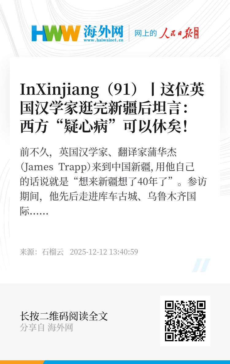 前不久,英国汉学家、翻译家蒲华杰(James Trapp)来到中国新疆,用他自己的话说就是“想来新疆想了40年了”。参访期间,他先后走进库车古城、乌鲁木齐国际大巴扎等地,亲身感受当地的历史文化与当代发展,街头巷尾汉语、维吾尔语双语同用的招牌,传统饮食与现代生活的融合,新疆人的热情给他留下了深刻的印象。