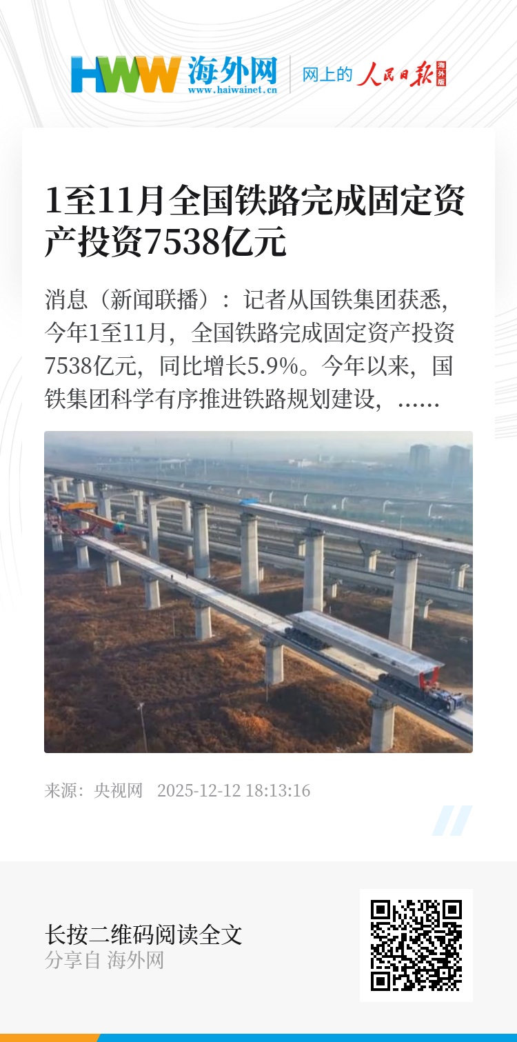央视网消息(新闻联播):记者从国铁集团获悉,今年1至11月,全国铁路完成固定资产投资7538亿元,同比增长5.9%。