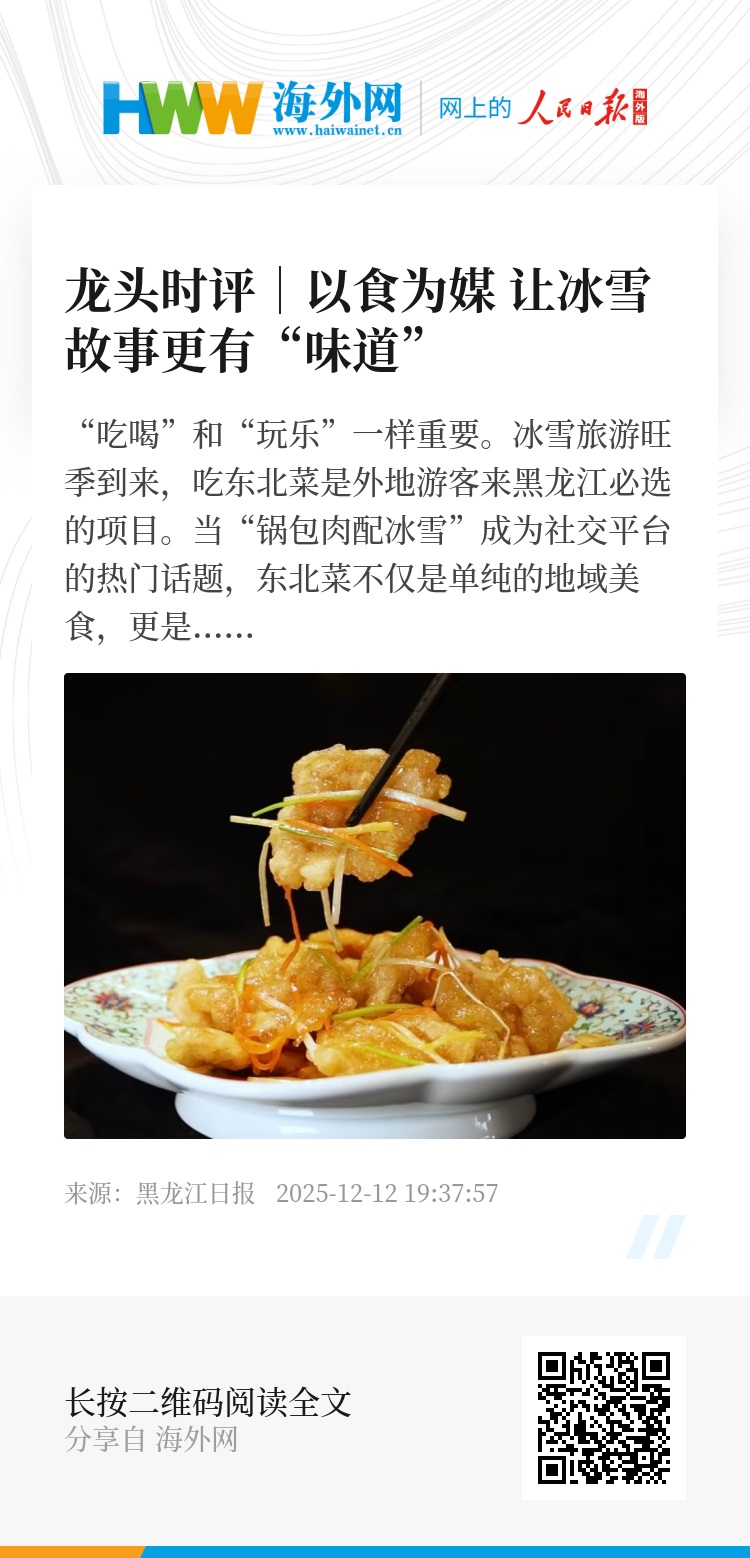 当前,龙江冰雪旅游旺季已开始,东北菜正迎来绝佳的市场契机,“美食+冰雪”模式是道必答题。在热气腾腾的杀猪菜浓香中,在人声鼎沸的冷水鱼冬捕季现场,游客们在大快朵颐的同时,加深了对黑龙江省历史文化的了解,濡染了黑土地奋进豪放的精气神。相信他们在社交媒体互动和亲友口耳相传中,会把黑龙江的故事传得更远。