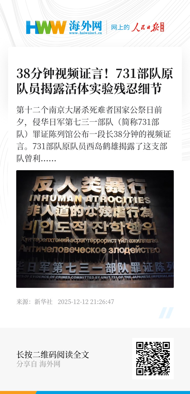 据馆方介绍,这份视频是由日本学者西里扶甬子在1997年录制的,于2019年捐赠给该馆。这一口述史料从加害者的视角,进一步还原了731部队的犯罪链条,再次证明侵华日军细菌战罪行是系统性的、非人道的,是不容置疑的历史真相。(记者杨思琪、何山)