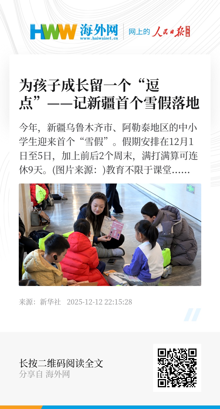 教育不限于课堂,成长不止于书本。雪假既是积极响应探索春秋假的政策号召,也是“双减”推行后,新疆结合地方资源禀赋,将教育从传统学校课堂引向广阔天地的一次生动实践。