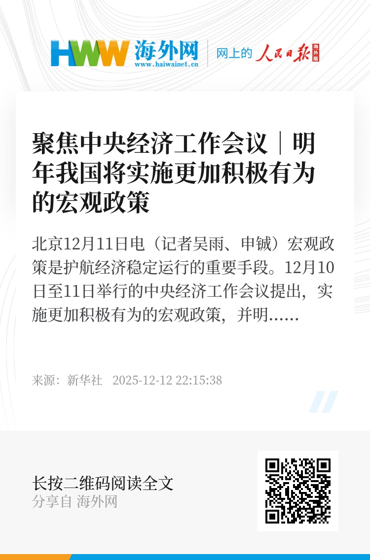 新华社北京12月11日电(记者吴雨、申铖)宏观政策是护航经济稳定运行的重要手段。12月10日至11日举行的中央经济工作会议提出,实施更加积极有为的宏观政策,并明确要继续实施更加积极的财政政策,要继续实施适度宽松的货币政策。