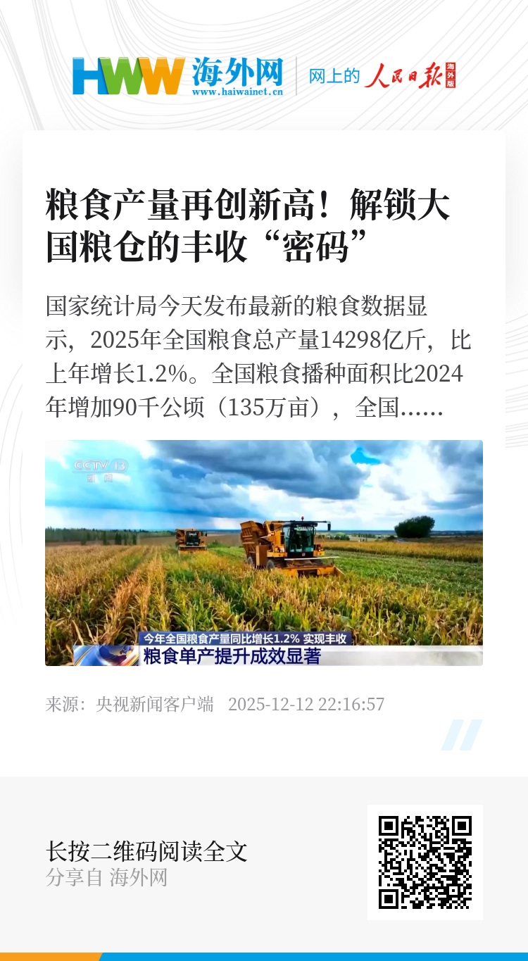 国家统计局今天发布最新的粮食数据显示,2025年全国粮食总产量14298亿斤,比上年增长1.2%。全国粮食播种面积比2024年增加90千公顷(135万亩),全国粮食单位面积产量比2024年增加65.7公斤/公顷(4.4公斤/亩),增长1.1%。