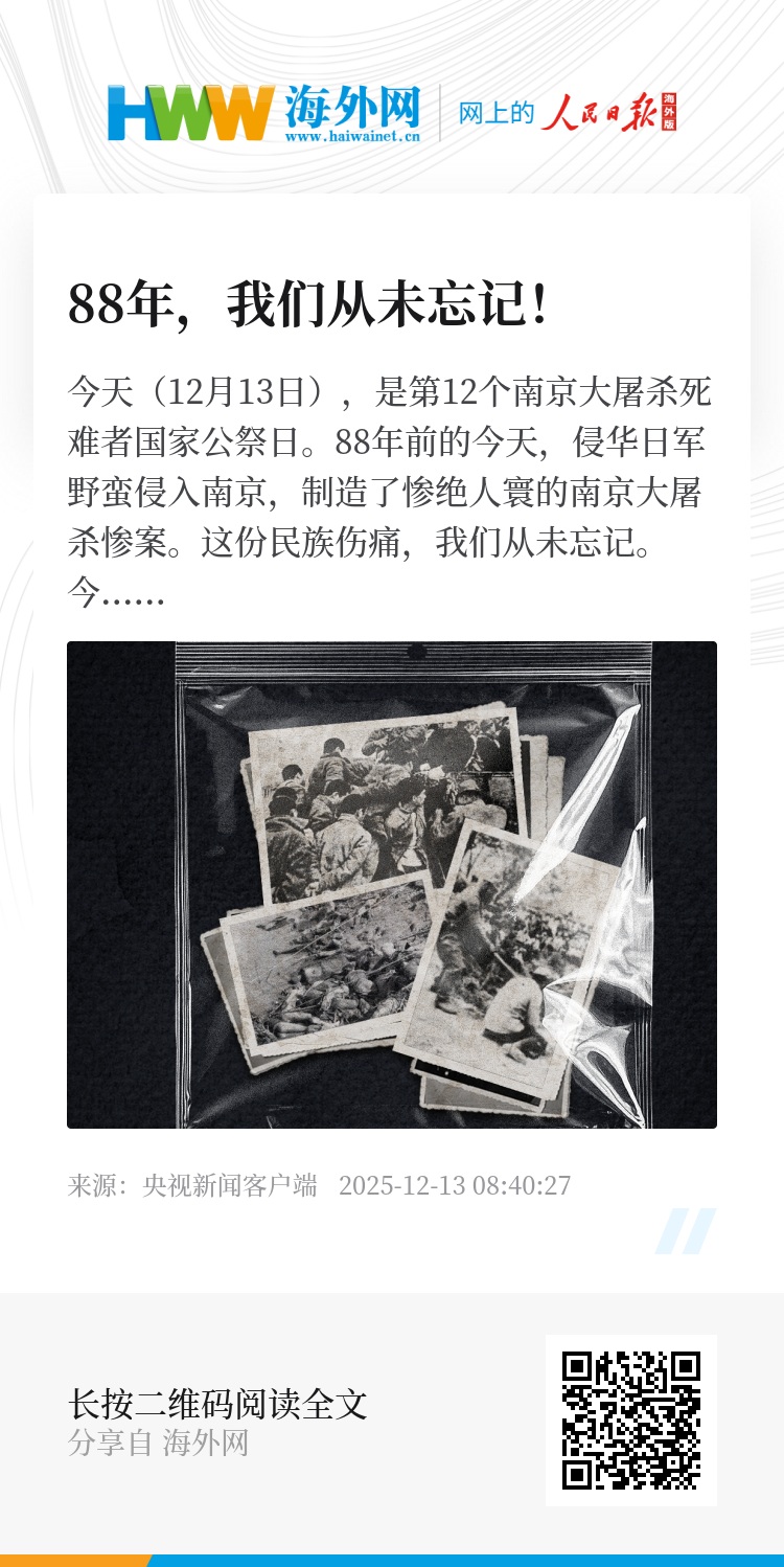 今天(12月13日),是第12个南京大屠杀死难者国家公祭日。88年前的今天,侵华日军野蛮侵入南京,制造了惨绝人寰的南京大屠杀惨案。这份民族伤痛,我们从未忘记。今天,以国之名祭奠遇难同胞,铭记历史,吾辈自强!