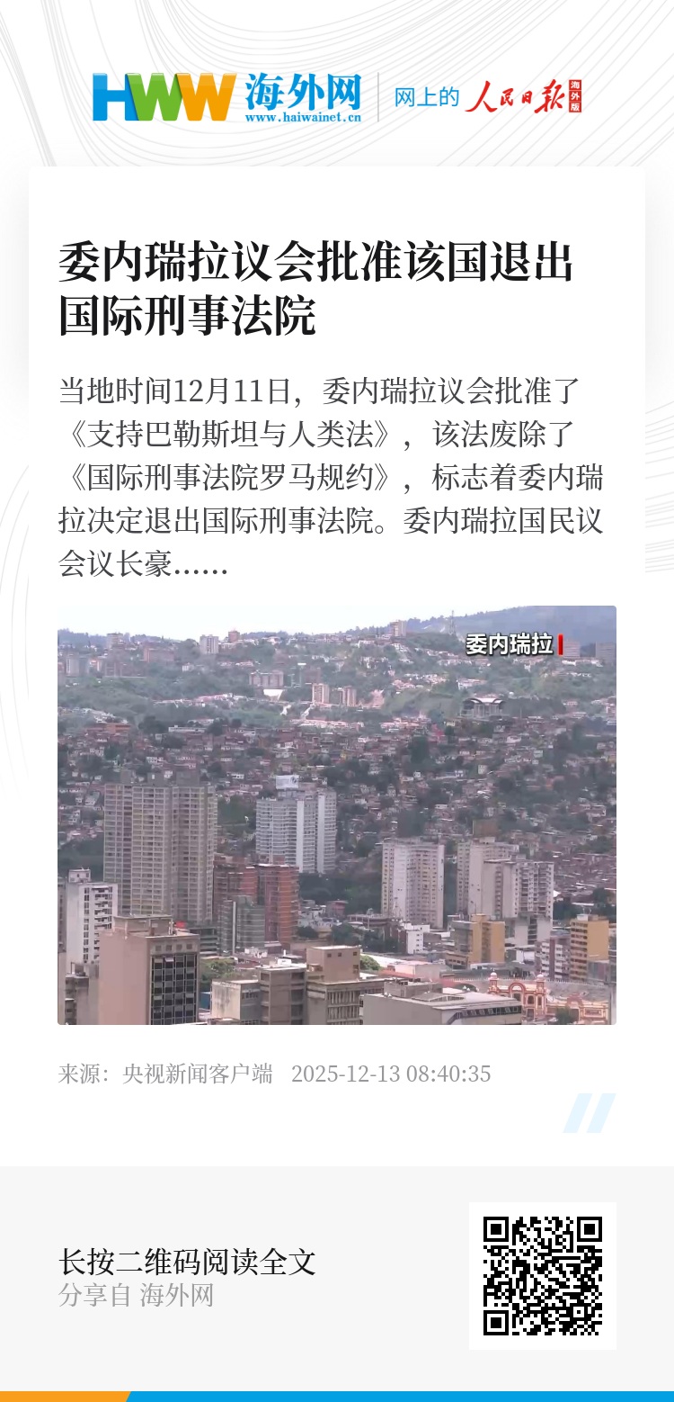 当地时间12月11日,委内瑞拉议会批准了《支持巴勒斯坦与人类法》,该法废除了《国际刑事法院罗马规约》,标志着委内瑞拉决定退出国际刑事法院。