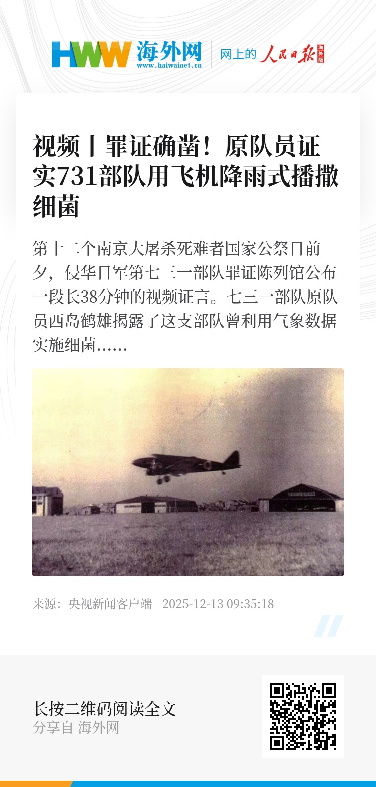 第十二个南京大屠杀死难者国家公祭日前夕,侵华日军第七三一部队罪证陈列馆公布一段长38分钟的视频证言。七三一部队原队员西岛鹤雄揭露了这支部队曾利用气象数据实施细菌播撒和冻伤活体实验。