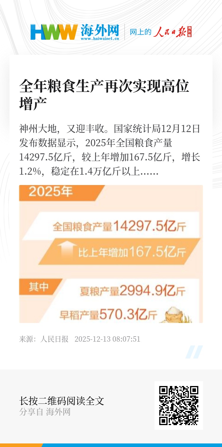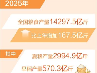 国家统计局12月12日发布数据显示,2025年全国粮食产量14297.5亿斤,较上年增加167.5亿斤,增长1.2%,稳定在1.4万亿斤以上,再次实现高位增产。