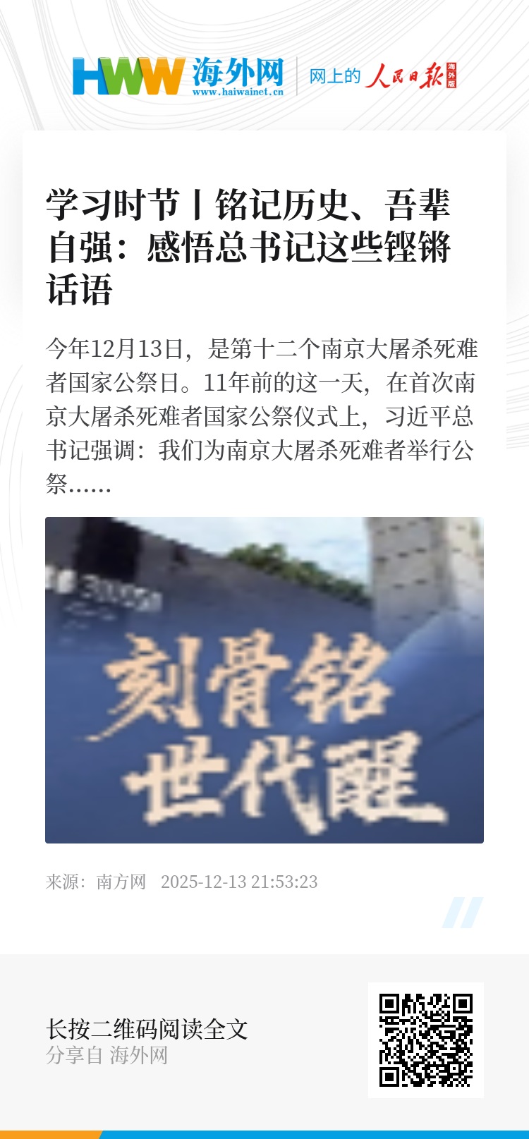 历史照亮未来,征程未有穷期。让我们重温习近平总书记相关重要论述,缅怀在战争中牺牲的死难同胞和革命先烈,在推进中国式现代化新征程上凝聚起奋进的力量。