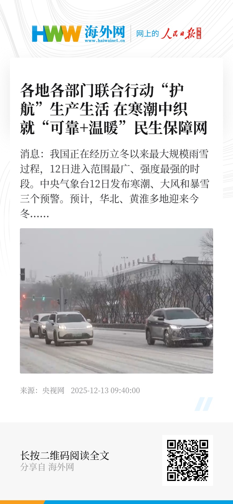 央视网消息:我国正在经历立冬以来最大规模雨雪过程,12日进入范围最广、强度最强的时段。