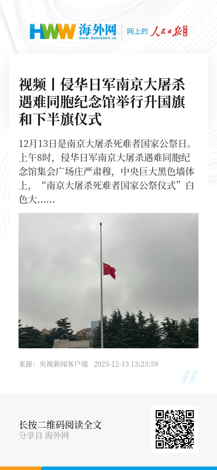 88年前的12月13日,侵华日军野蛮侵入南京,在长达40多天惨绝人寰的大屠杀中,30万同胞惨遭杀戮。2014年我国以立法形式将12月13日设立为南京大屠杀死难者国家公祭日。根据国务院批复,每年这一天,南京大屠杀死难者国家公祭仪式主会场均需下半旗。