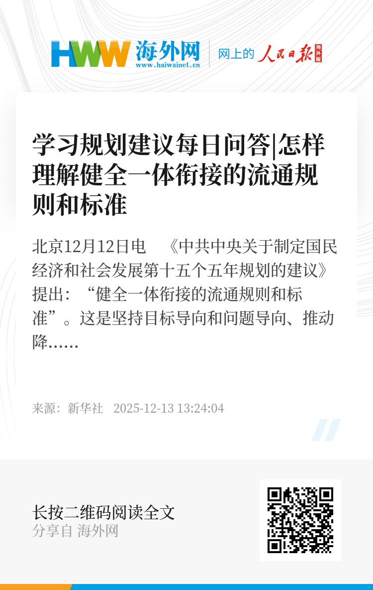 新华社北京12月12日电 《中共中央关于制定国民经济和社会发展第十五个五年规划的建议》提出:“健全一体衔接的流通规则和标准”。这是坚持目标导向和问题导向、推动降低全社会物流成本的重要举措,也是建设全国统一大市场的重要抓手。可以从以下3个方面理解。