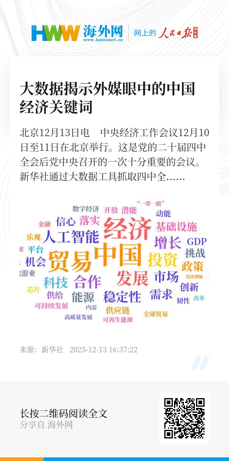 新华社通过大数据工具抓取四中全会以来1169家海外主流媒体有关报道发现,“发展”“增长”“稳定性”“贸易”“投资”“合作”“市场”“科技”“人工智能”“创新”等成为海外聚焦中国经济的高频词。