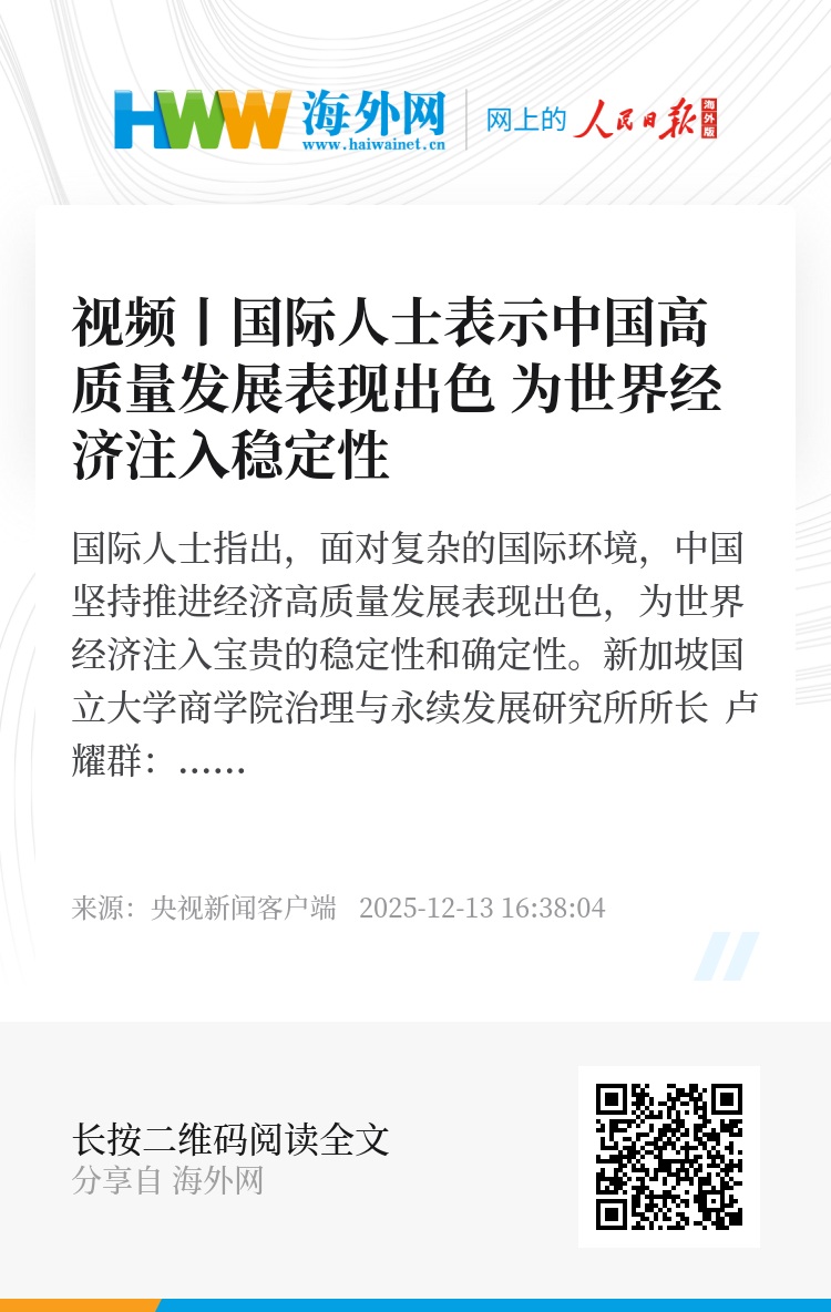 新加坡国立大学商学院治理与永续发展研究所所长 卢耀群:尽管全球面临不确定性带来的逆风,但中国经济的表现依然十分出色,中国注重高质量发展,推动经济向新向优转型,实现各领域稳定增长,为新一阶段的发展奠定了坚实基础,可以看到中国下一阶段发展的重点包括创新、科技、消费等,这将为中国人民带来更高品质的生活,也有助于增进全球人民的福祉。