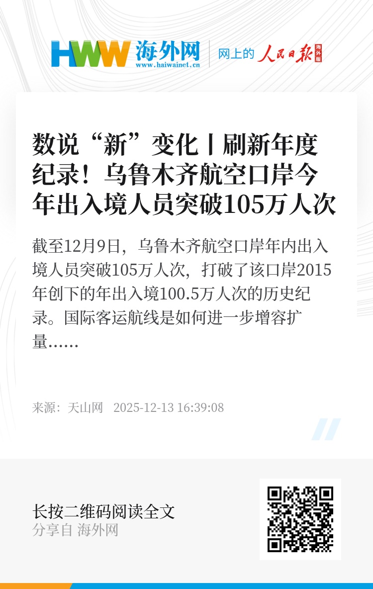 截至12月9日,乌鲁木齐航空口岸年内出入境人员突破105万人次,打破了该口岸2015年创下的年出入境100.5万人次的历史纪录。国际客运航线是如何进一步增容扩量的?国际客流持续保持快速增长,其背后动因为何?本期《数说“新”变化》为你解读。