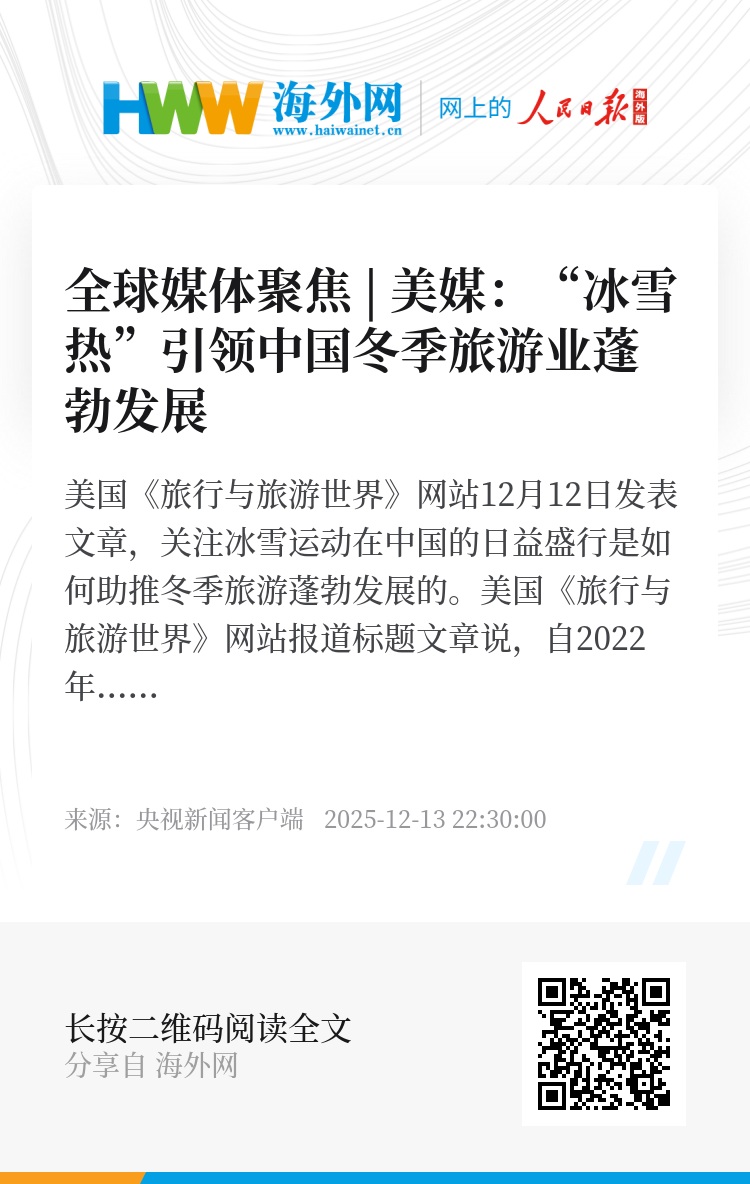 文章还说,随着中国冬季旅游产业的不断壮大,可持续发展理念、环保实践也日益受到重视。中国正成为越来越有吸引力的冬季旅游目的地。
