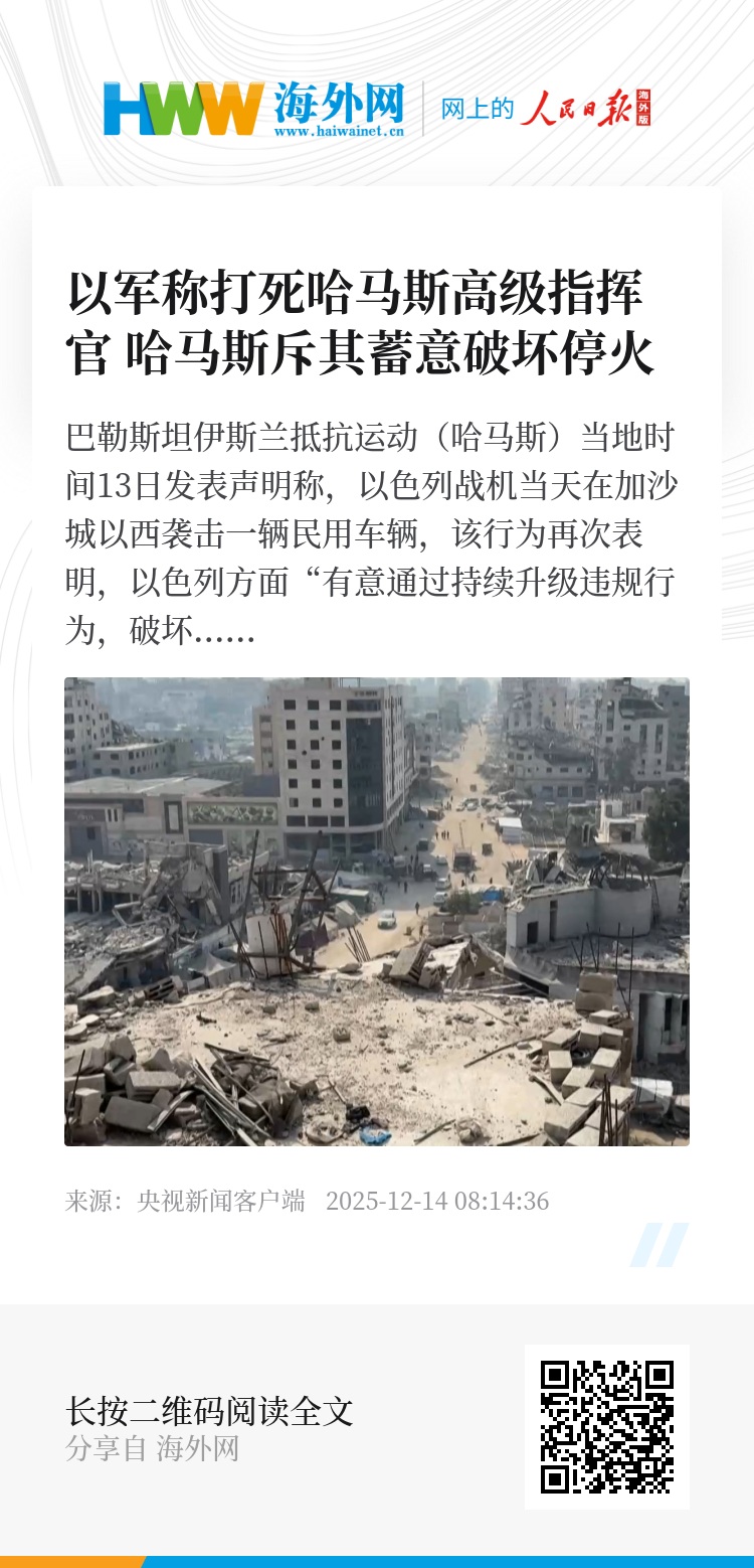 巴勒斯坦伊斯兰抵抗运动(哈马斯)当地时间13日发表声明称,以色列战机当天在加沙城以西袭击一辆民用车辆,该行为再次表明,以色列方面“有意通过持续升级违规行为,破坏并挫败停火协议”。
