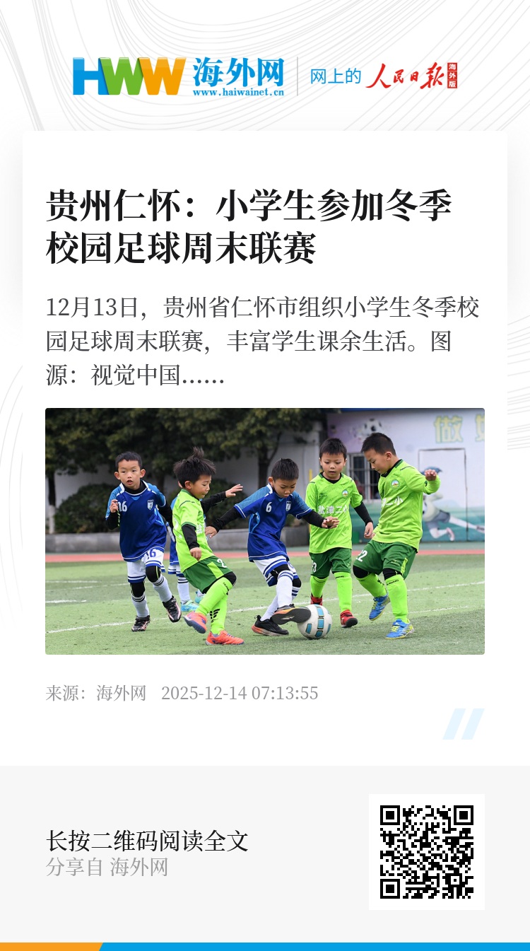 12月13日,贵州省仁怀市组织小学生冬季校园足球周末联赛,丰富学生课余生活。图源:视觉中国