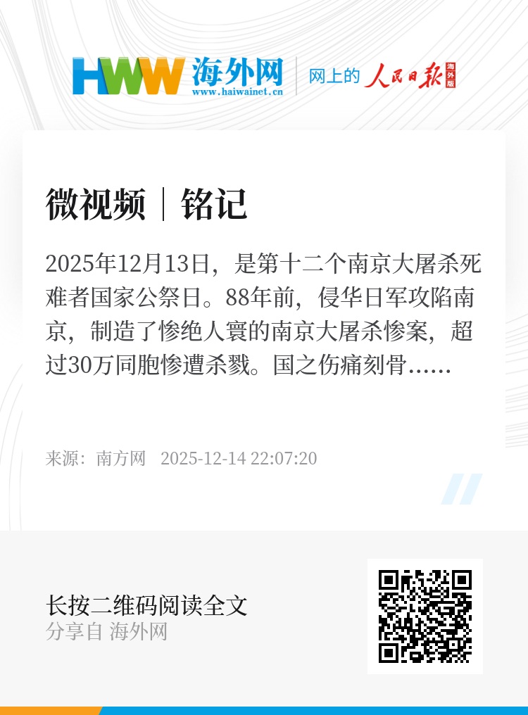 2025年12月13日,是第十二个南京大屠杀死难者国家公祭日。88年前,侵华日军攻陷南京,制造了惨绝人寰的南京大屠杀惨案,超过30万同胞惨遭杀戮。国之伤痛刻骨铭心,这段血泪交织的历史,从未远去,更永不能忘。