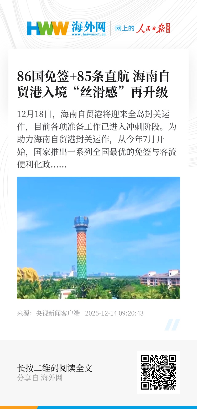 截至12月12日,海南今年出入境人员已达247万人次,其中免签入境外国人达54.8万人次,占入境外国旅客总数的89.6%,较历史最高峰增长25%。搭配“航线扩容+政策优化”,海南已开通85条国际航线,自贸港磁吸效应持续凸显。