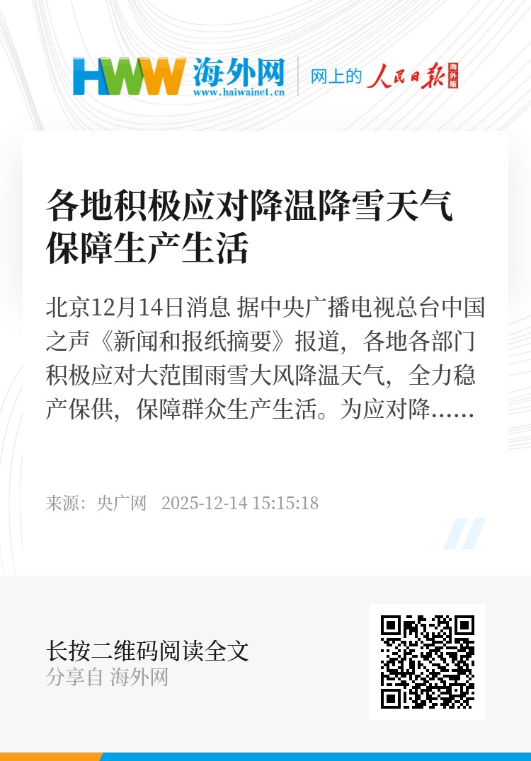 央广网北京12月14日消息 据中央广播电视总台中国之声《新闻和报纸摘要》报道,各地各部门积极应对大范围雨雪大风降温天气,全力稳产保供,保障群众生产生活。