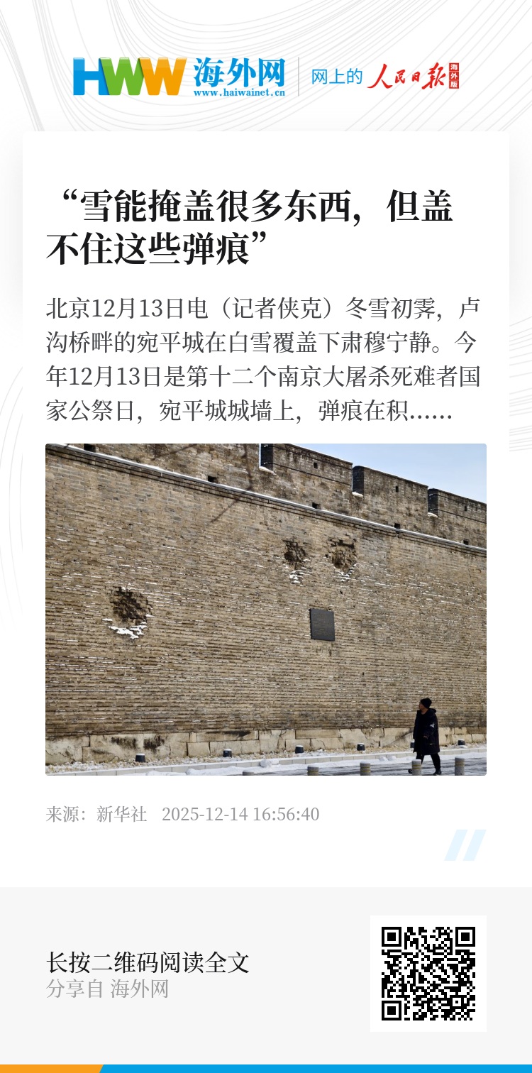 新华社北京12月13日电(记者侠克)冬雪初霁,卢沟桥畔的宛平城在白雪覆盖下肃穆宁静。今年12月13日是第十二个南京大屠杀死难者国家公祭日,宛平城城墙上,弹痕在积雪的映照下更加清晰、深邃,历史也在冬日清晰浮现。