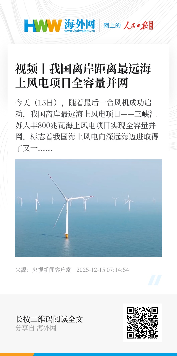 今天(15日),随着最后一台风机成功启动,我国离岸最远海上风电项目——三峡江苏大丰800兆瓦海上风电项目实现全容量并网,标志着我国海上风电向深远海迈进取得了又一重大突破。