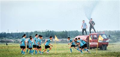 《进球吧!儿子娃娃》剧组在阿依丁库勒草原上拍摄小球员集训片段。