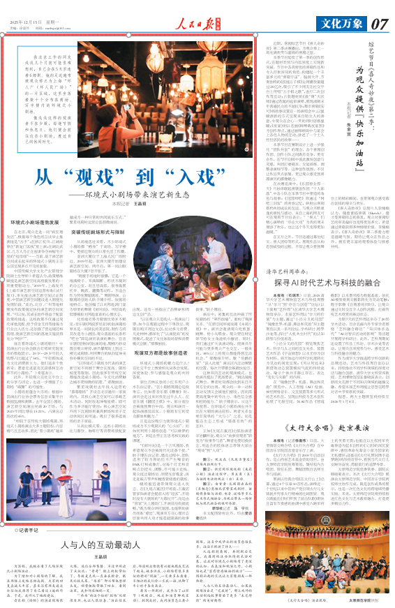 “以环境式小剧场为代表的演艺新空间不再囿于舞台长宽高、剧场坡度等限制,因此很多非传统空间都能改造成小剧场,令文化消费触达城市更细微的肌理。”郝微丽说。