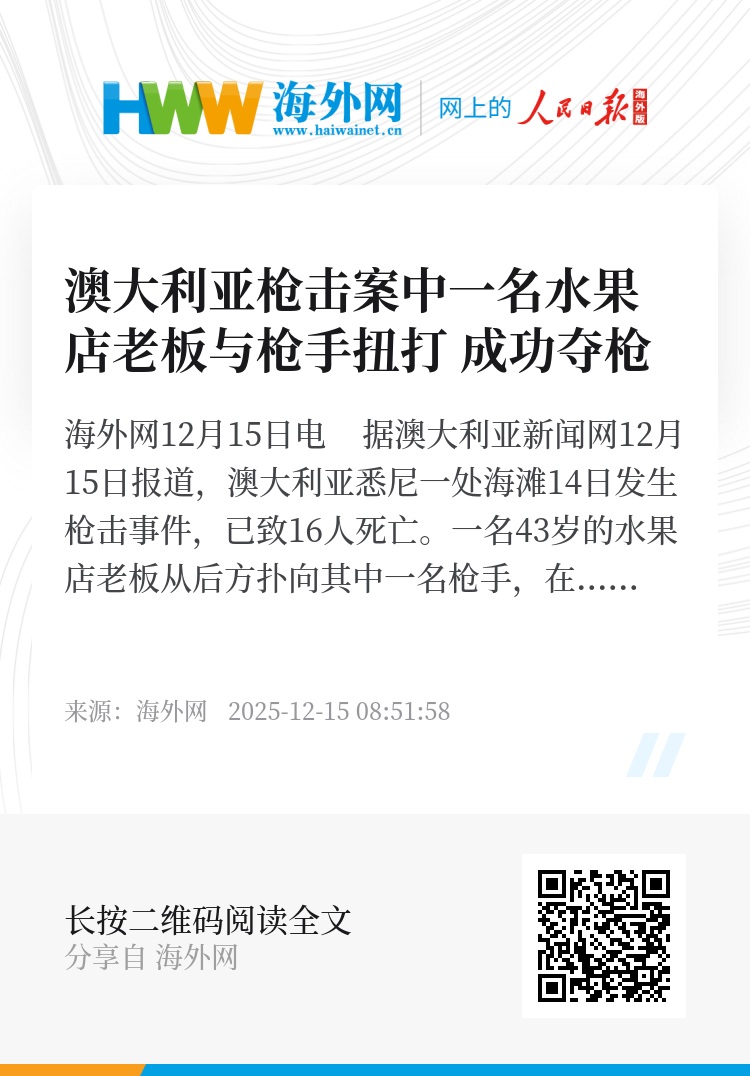 海外网12月15日电 据澳大利亚新闻网12月15日报道,澳大利亚悉尼一处海滩14日发生枪击事件,已致16人死亡。一名43岁的水果店老板从后方扑向其中一名枪手,在扭打中成功夺下了武器,迫使枪手撤退。这名英勇的水果店老板在此次事件中身中2枪,目前在当地医院接受治疗。(海外网 张霓)