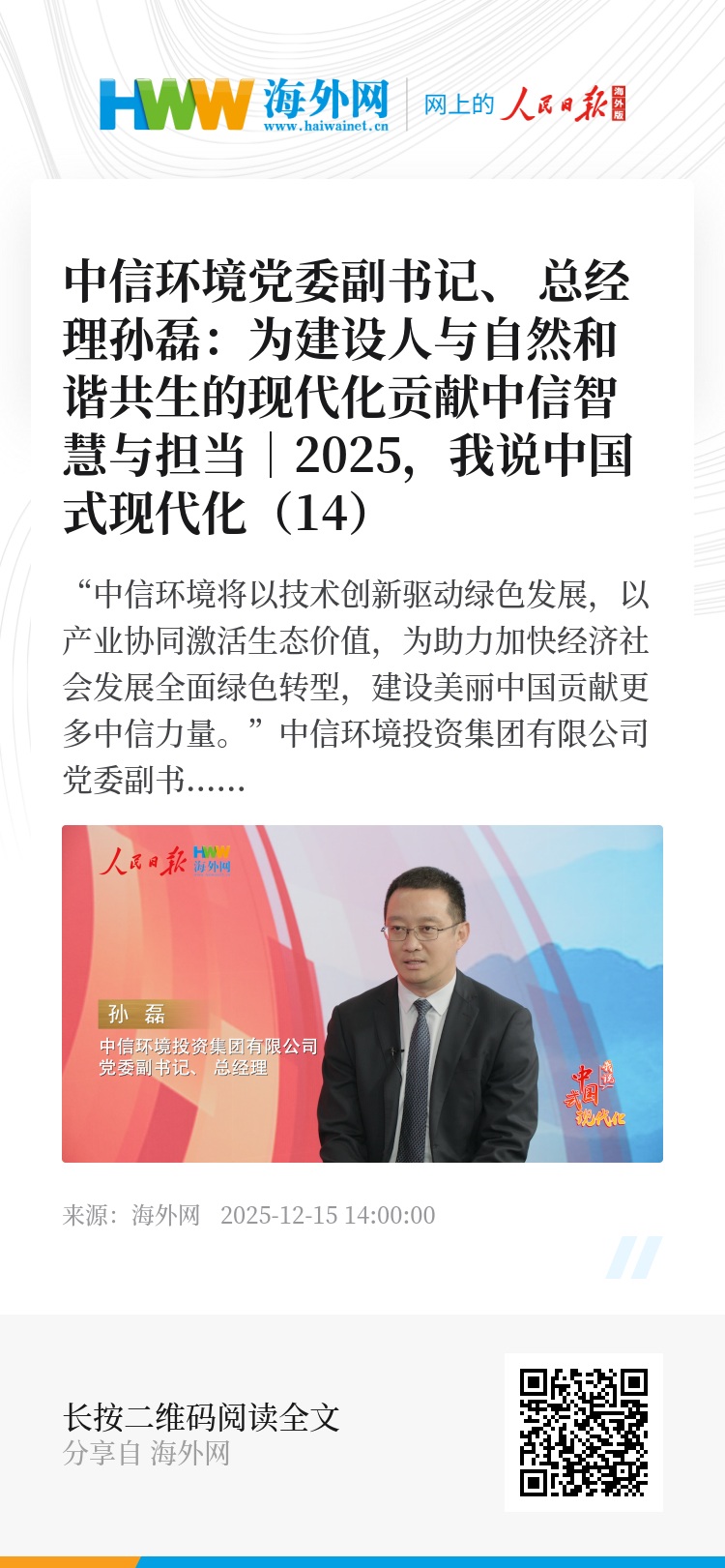 “中信环境将以技术创新驱动绿色发展,以产业协同激活生态价值,为助力加快经济社会发展全面绿色转型,建设美丽中国贡献更多中信力量。”中信环境投资集团有限公司(以下简称中信环境)党委副书记、总经理孙磊说。