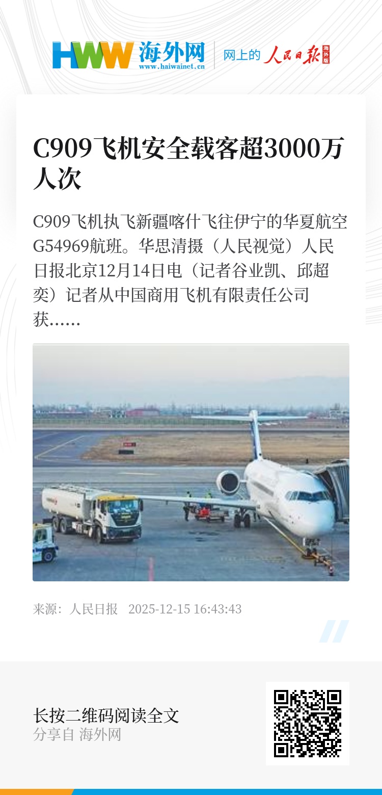 人民日报北京12月14日电(记者谷业凯、邱超奕)记者从中国商用飞机有限责任公司获悉:目前,C909飞机安全载客超3000万人次。C909已交付175架,占国内支线客机60%以上;海外运行12个国家。