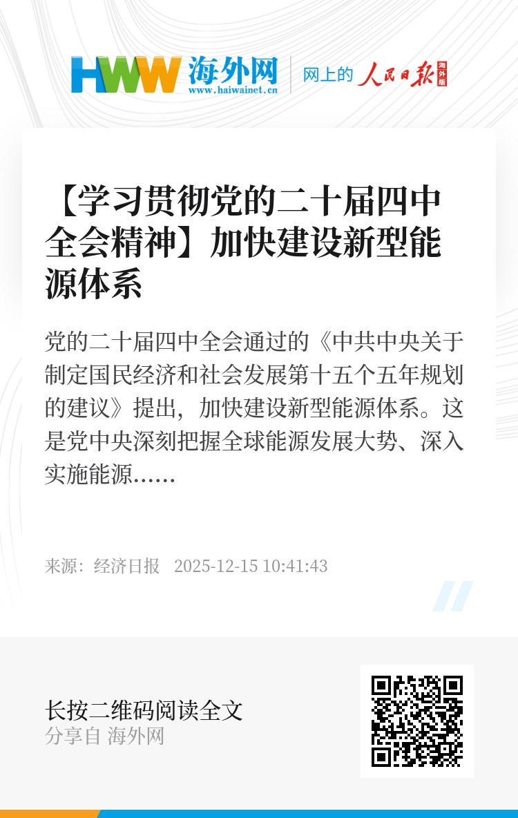 党的二十届四中全会通过的《中共中央关于制定国民经济和社会发展第十五个五年规划的建议》提出,加快建设新型能源体系。这是党中央深刻把握全球能源发展大势、深入实施能源安全新战略的重大决策,是新时代新征程推动能源高质量发展、建设能源强国的部署要求。“十五五”时期是我国新型能源体系建设“夯基垒台”的关键时期,必须坚持系统观念,统筹发展和安全,兼顾当前和长远,合理把握节奏力度,加快建设清洁低碳安全高效的新型能源体系,为推动高质量发展、推进中国式现代化提供能源支撑。