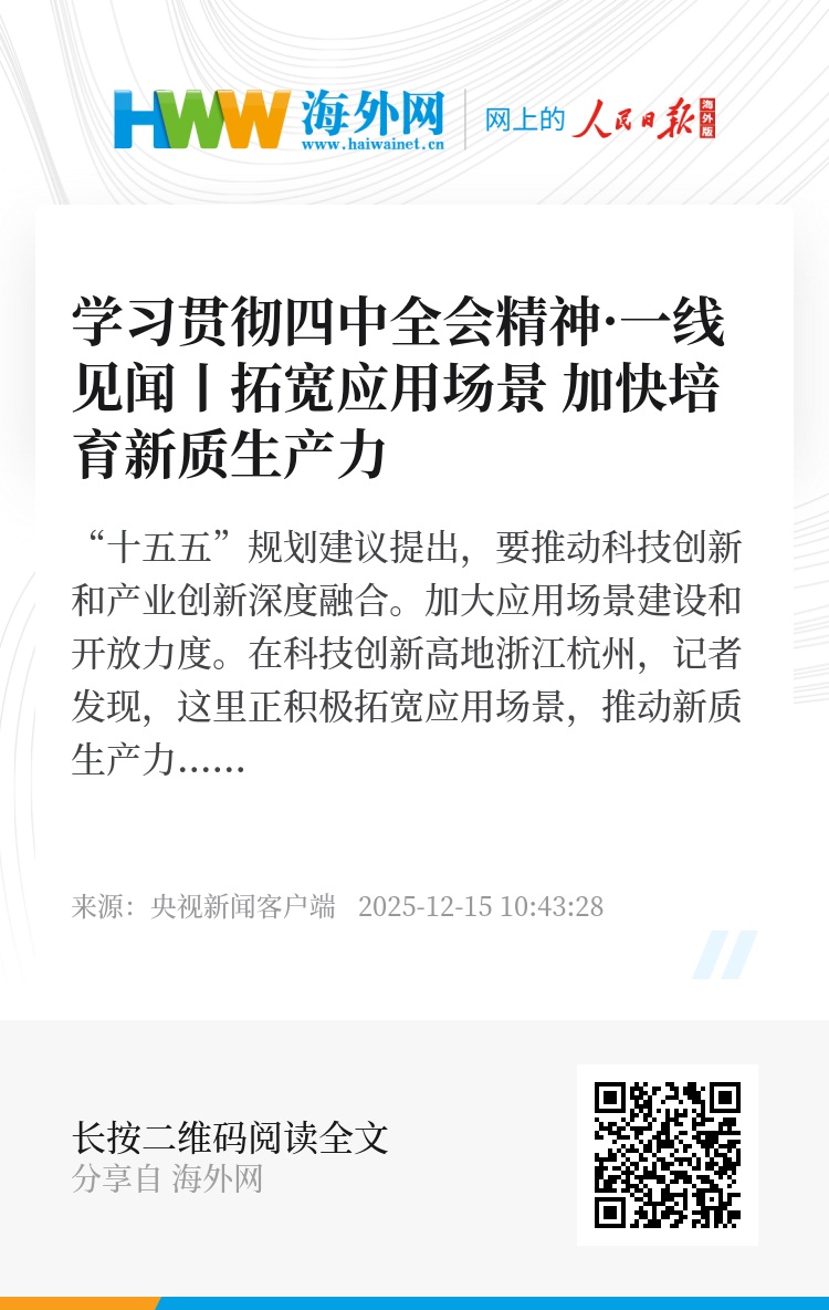 “十五五”规划建议提出,要推动科技创新和产业创新深度融合。加大应用场景建设和开放力度。在科技创新高地浙江杭州,记者发现,这里正积极拓宽应用场景,推动新质生产力加快形成。
