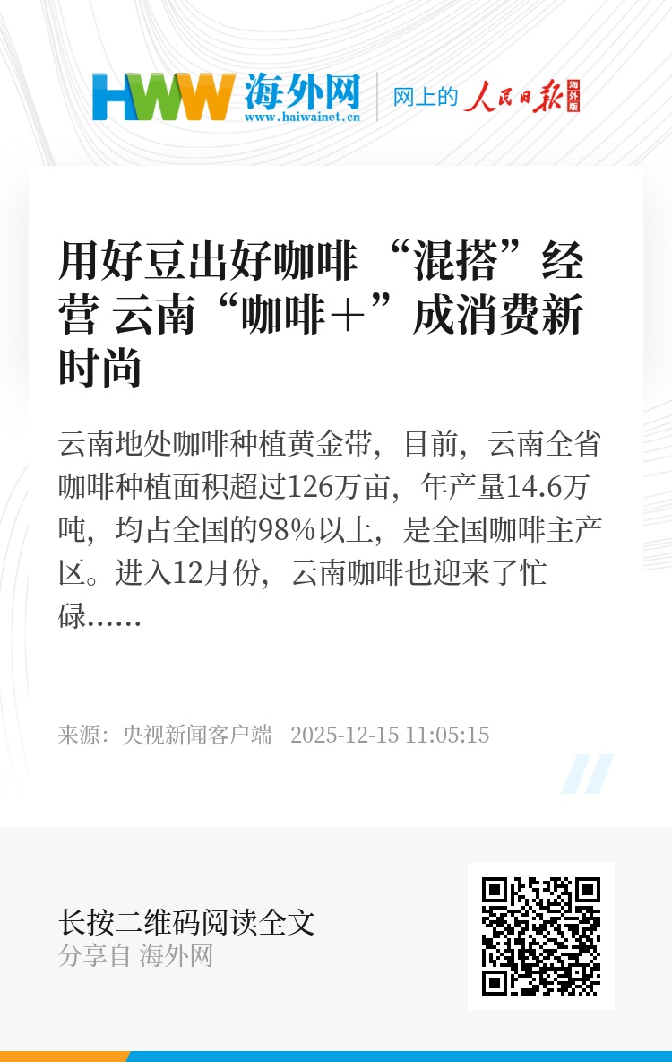 《2025中国城市咖啡发展报告》显示,2024年,我国咖啡产业规模达3133亿元,较上年增长18.1%;人均年饮用数提升至22.24杯,相比上年(16.74杯)有所提升,本土咖啡消费市场仍有巨大潜力。2024年,云南咖啡庄园接待游客超百万人次,带动三产综合产值突破90亿元,集咖啡种植、加工、体验、休闲、文旅于一体的“中国式咖啡社区”正在蓬勃发展。如今,中国咖啡正在衍生更多新业态、新场景、新趋势,为咖啡产业和消费市场提供更多新活力。