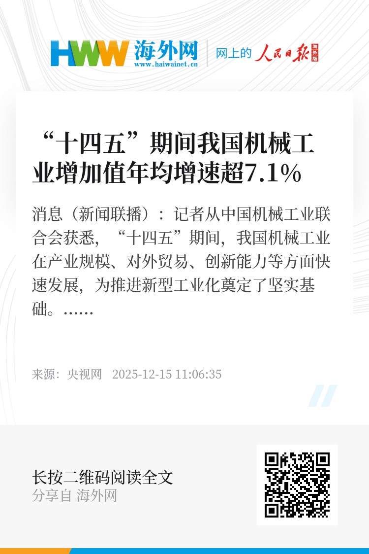 “十四五”期间,我国机械工业增加值年均增速超过7.1%,高于同期全国工业和制造业平均水平。规模以上企业数量从9.2万家增至2025年10月底的13.7万家。进出口额连续五年突破万亿美元。