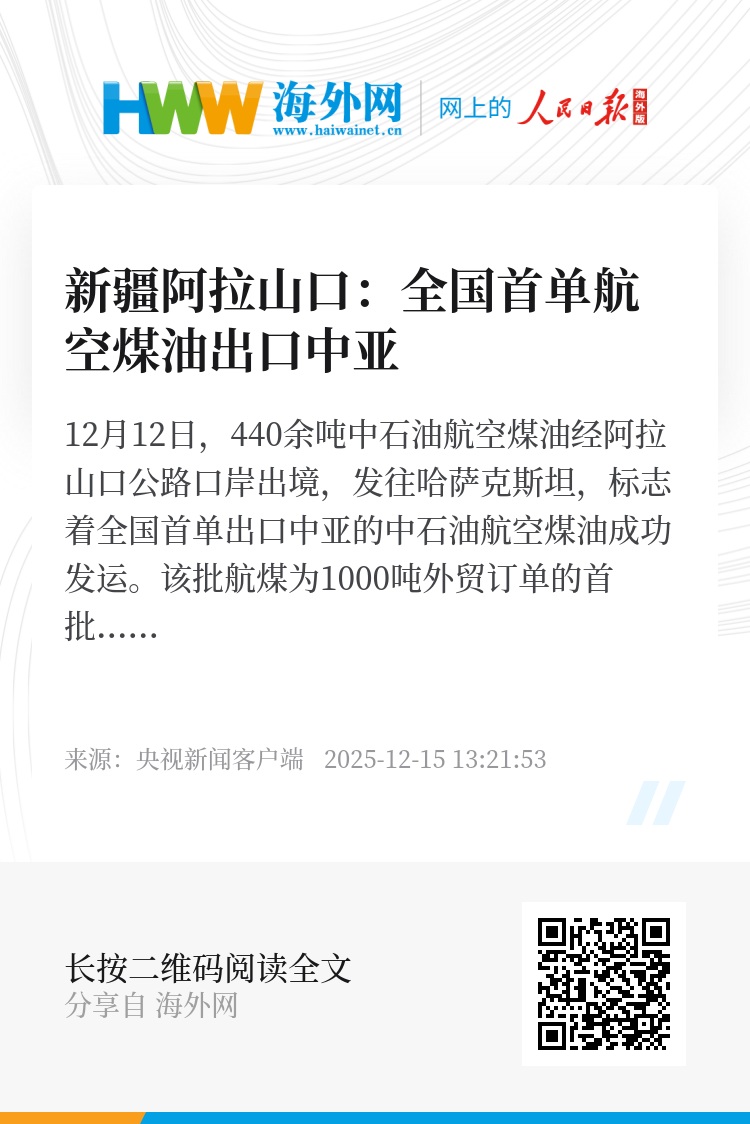 12月12日,440余吨中石油航空煤油经阿拉山口公路口岸出境,发往哈萨克斯坦,标志着全国首单出口中亚的中石油航空煤油成功发运。该批航煤为1000吨外贸订单的首批发货,实现了中哈能源合作从“资源引进”到“产品出口”的全链条覆盖。